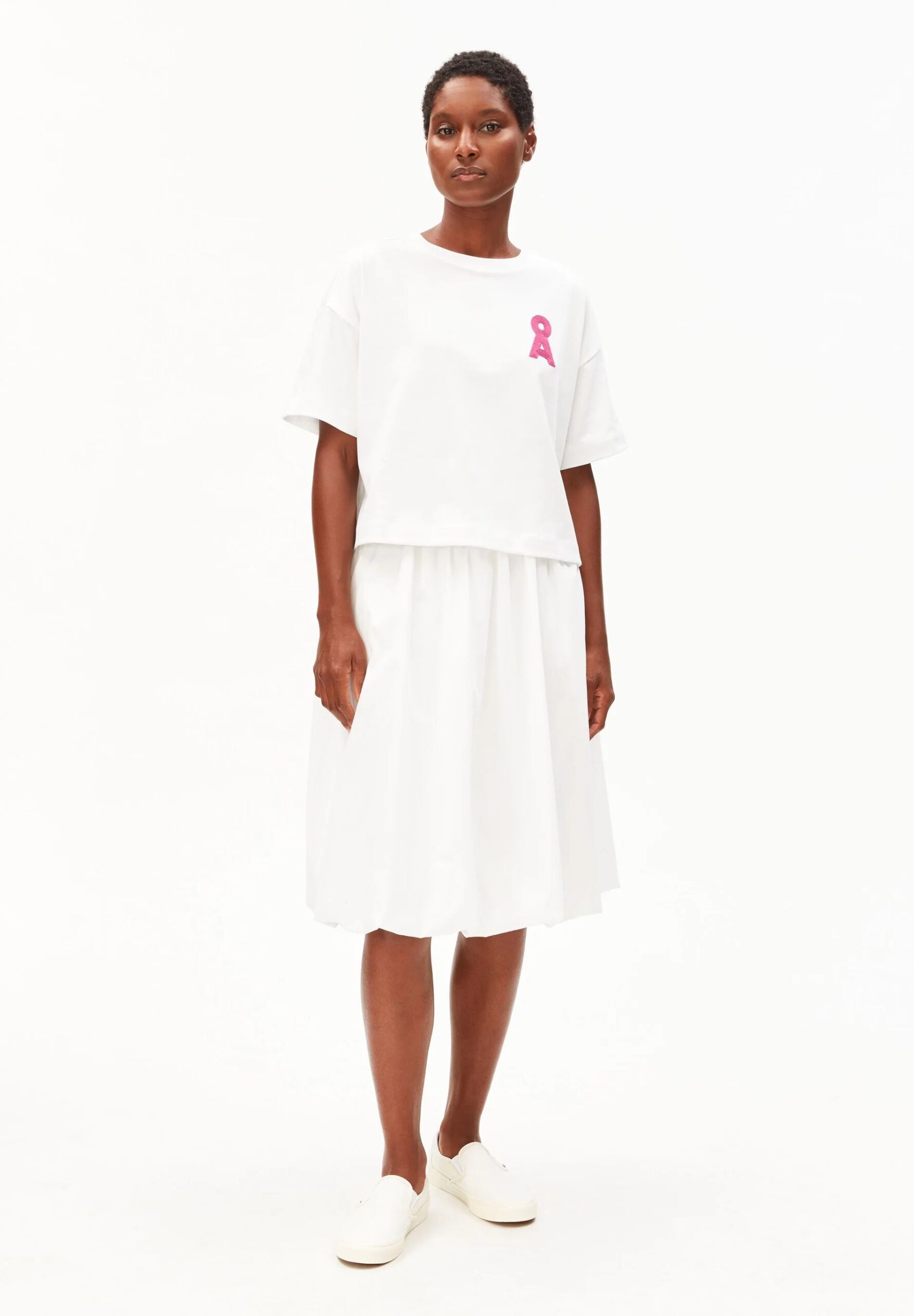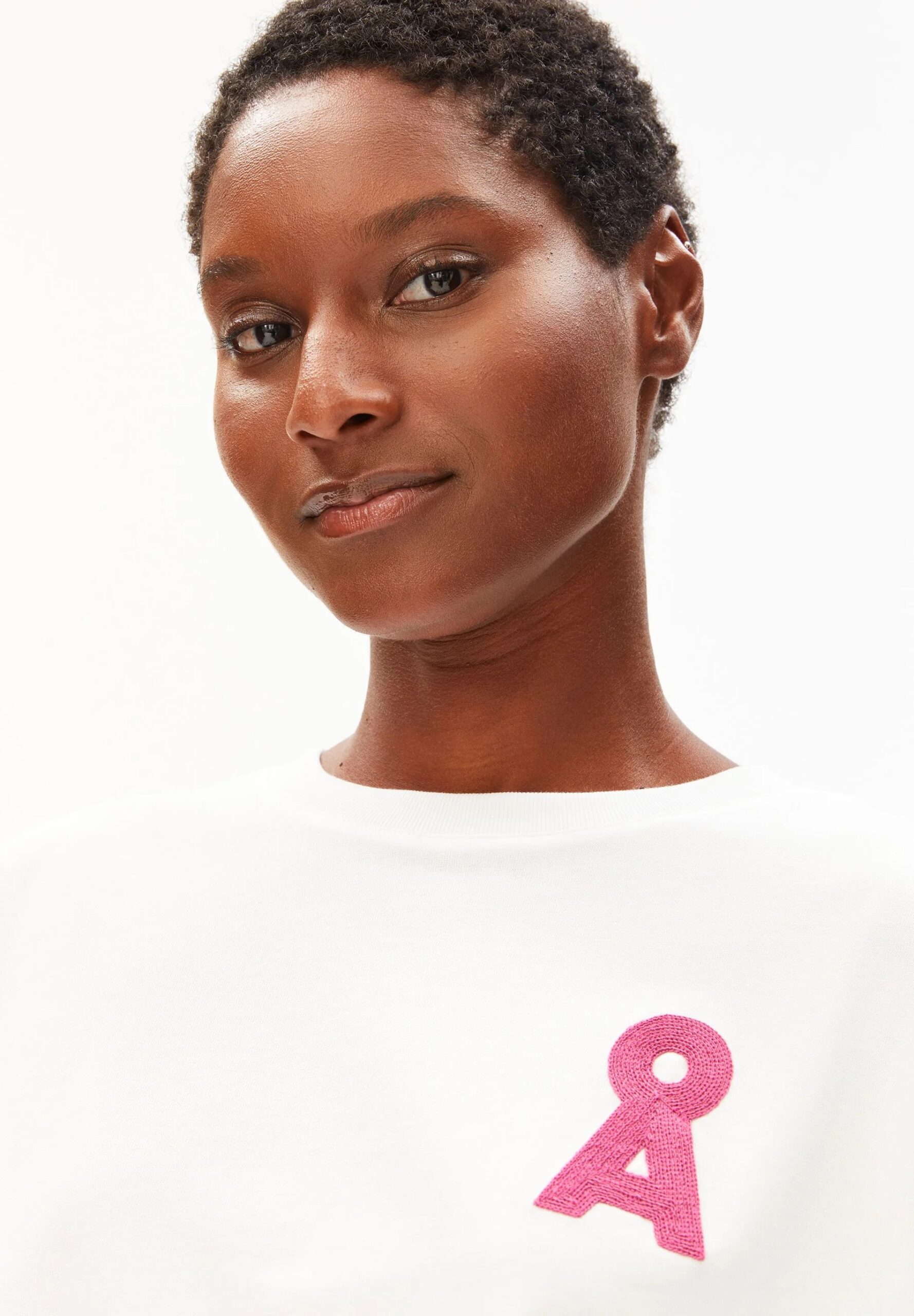 Albertaraa hat eine sehr lockere und verkürzte Passform, die sich sehr gut mit höher getragenen Hosen oder Jupes kombinieren lässt. Aus 100% Bio-Baumwolle ist dieses Shirt ein cooles Sommeressential, das Spass macht! Das gestickte ARMEDANGELS-Logo in pink ist dabei ein ganz besonderer Hingucker.