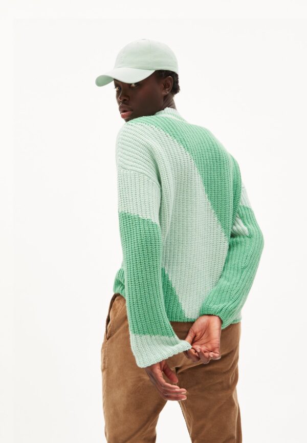 Der schöne Strickpullover Saadie Striped von Armedangels besticht durch das hochwertige Material aus 55% Wolle (bio) und 45% Baumwolle (bio) und den leuchtenden Grüntönen. Der weitere Schnitt lädt zum Wohlfühlen ein und lässt sich zur Hose, Leggings oder Rock tragen.