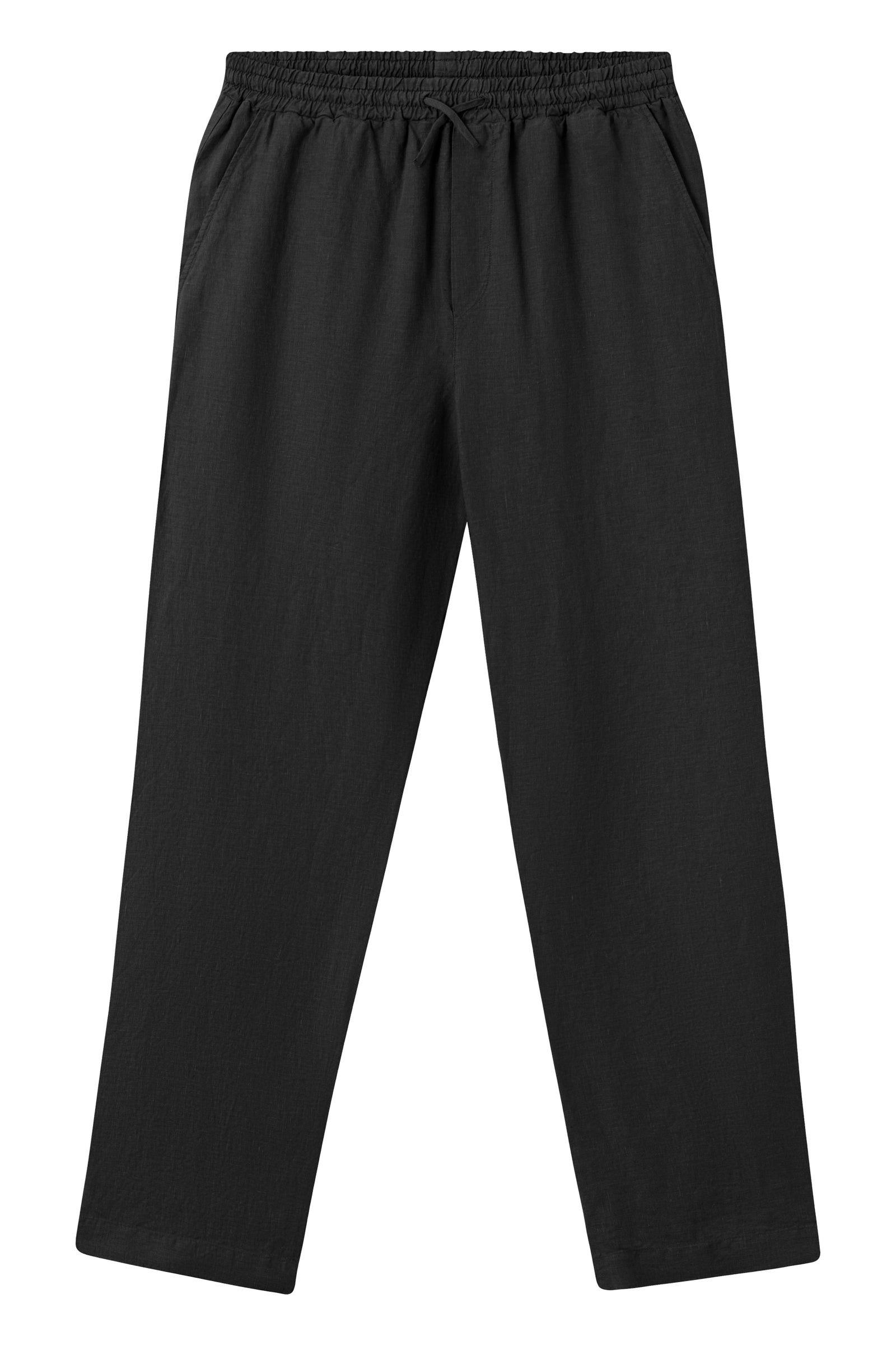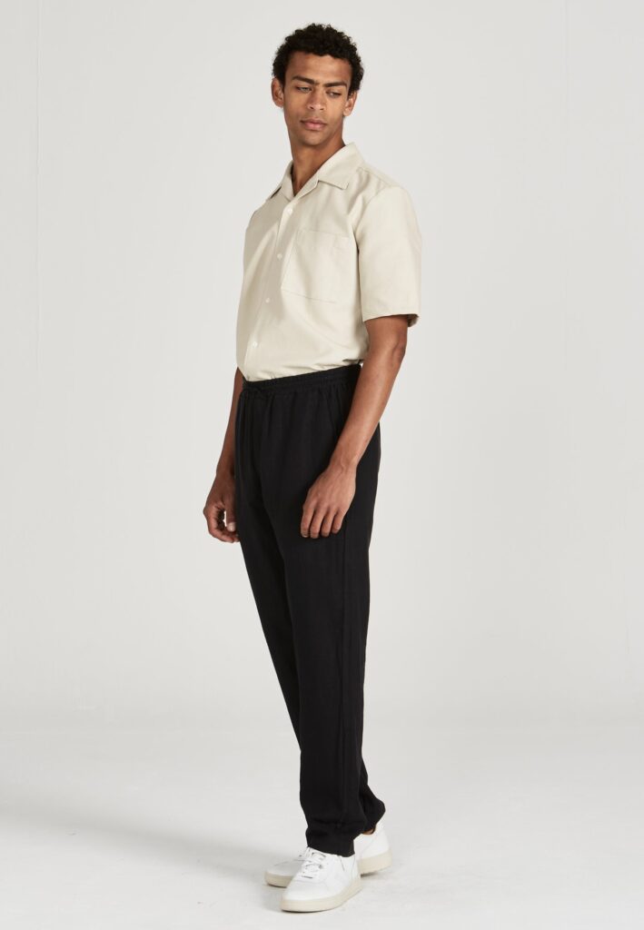 Eric von GIVN Berlin ist ein wahres Allroundtalent. Der Stil einer Hose und der Komfort einer Jogginghose in einem vereint. Dazu kommt schwarzes Leinen als unkompliziertes Sommeressential, das auch an wärmeren Tagen angenehm kühl auf der Haut liegt.