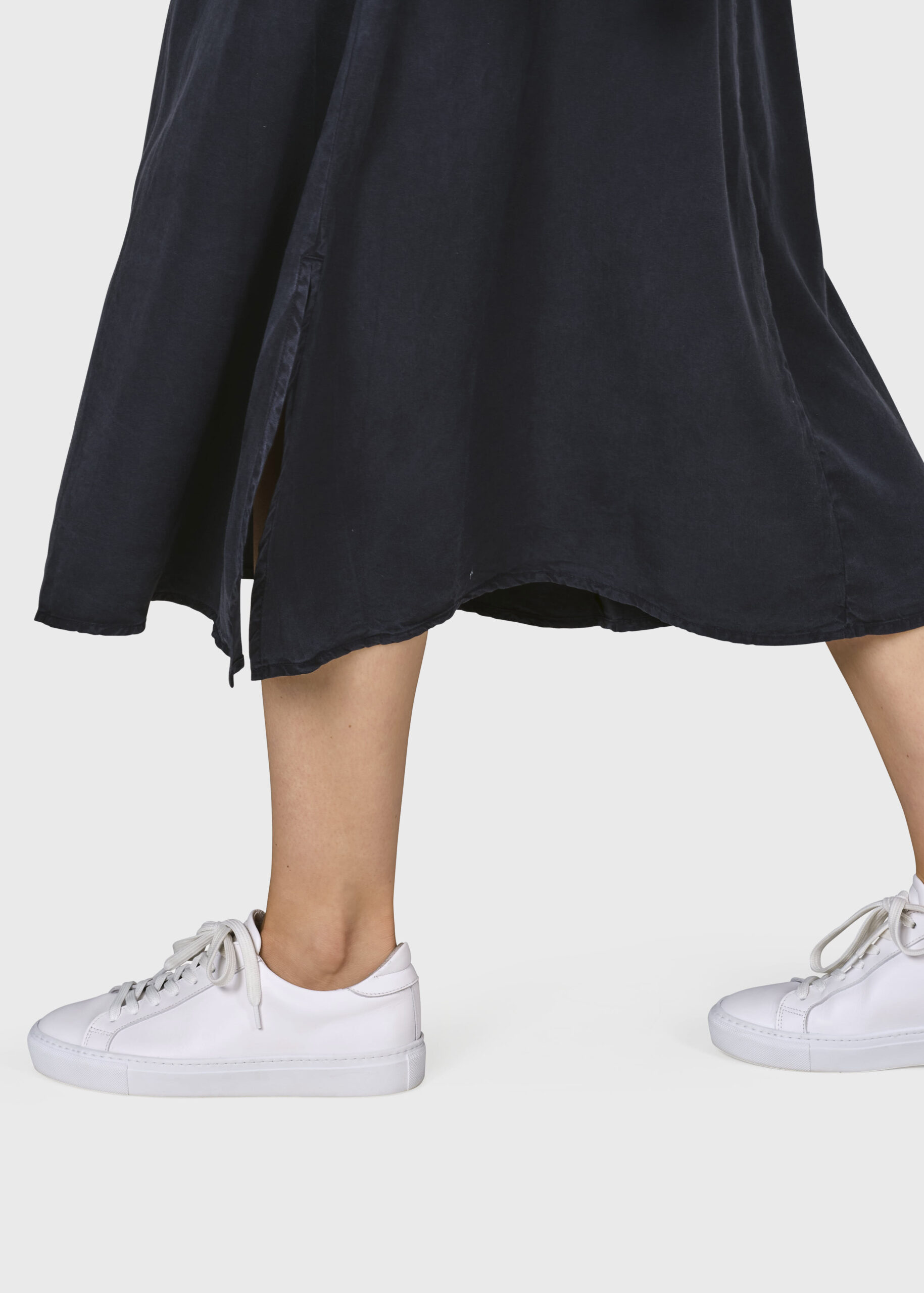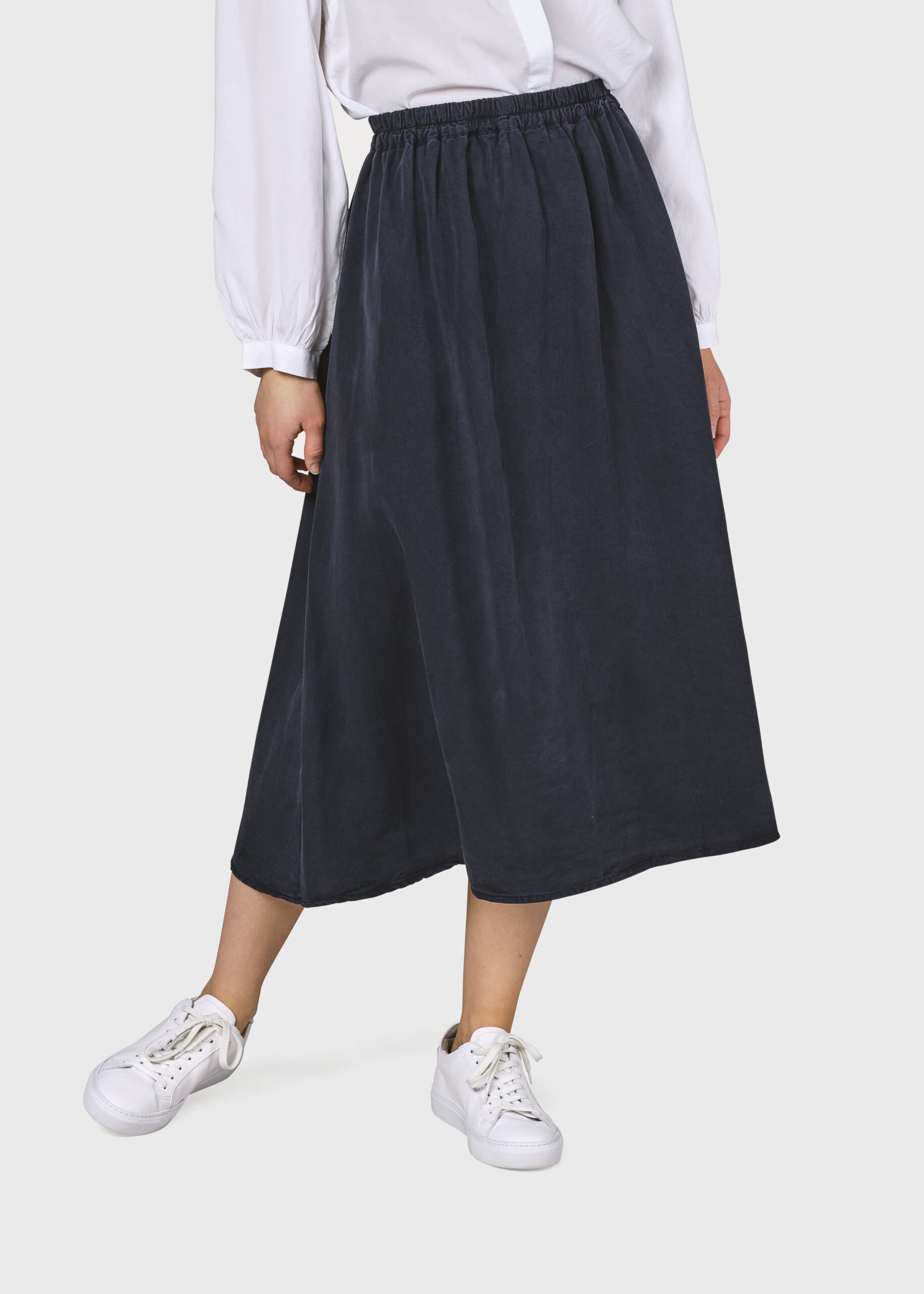 Ramona von Klitmøller ist ein toller mittellanger Rock aus hochwertigem Material, zarter Haptik und fliessender Optik. Dank dem Gummizug kannst du den Rock höher oder tiefer tragen, wie du gerade magst. Die Passform hat eine leichte A-Linie und wird durch einen Seitenschlitz und seitliche Eingriffstaschen abgerundet. Ein schönes Essential, das sich beliebig stylen lässt.